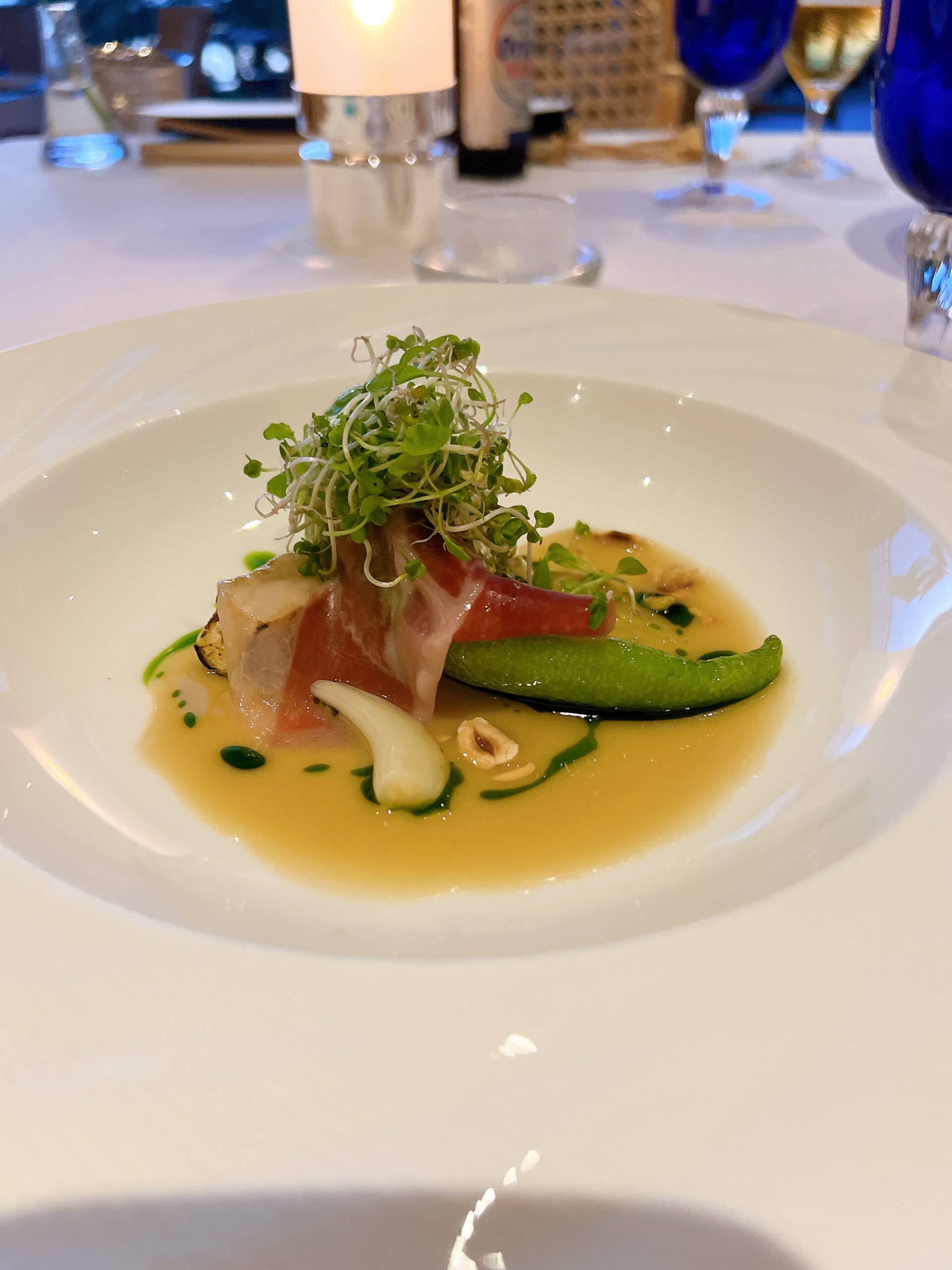 いきなりどーんと、こちらはコース料理での一品です。ホタテの焦げ具合に野菜の緑、アスパラが芸術作品のように添えられています。色、艶、バランス最高です。 目次 ディナー1日目もとぶ和牛とアボカドのタコス風 …